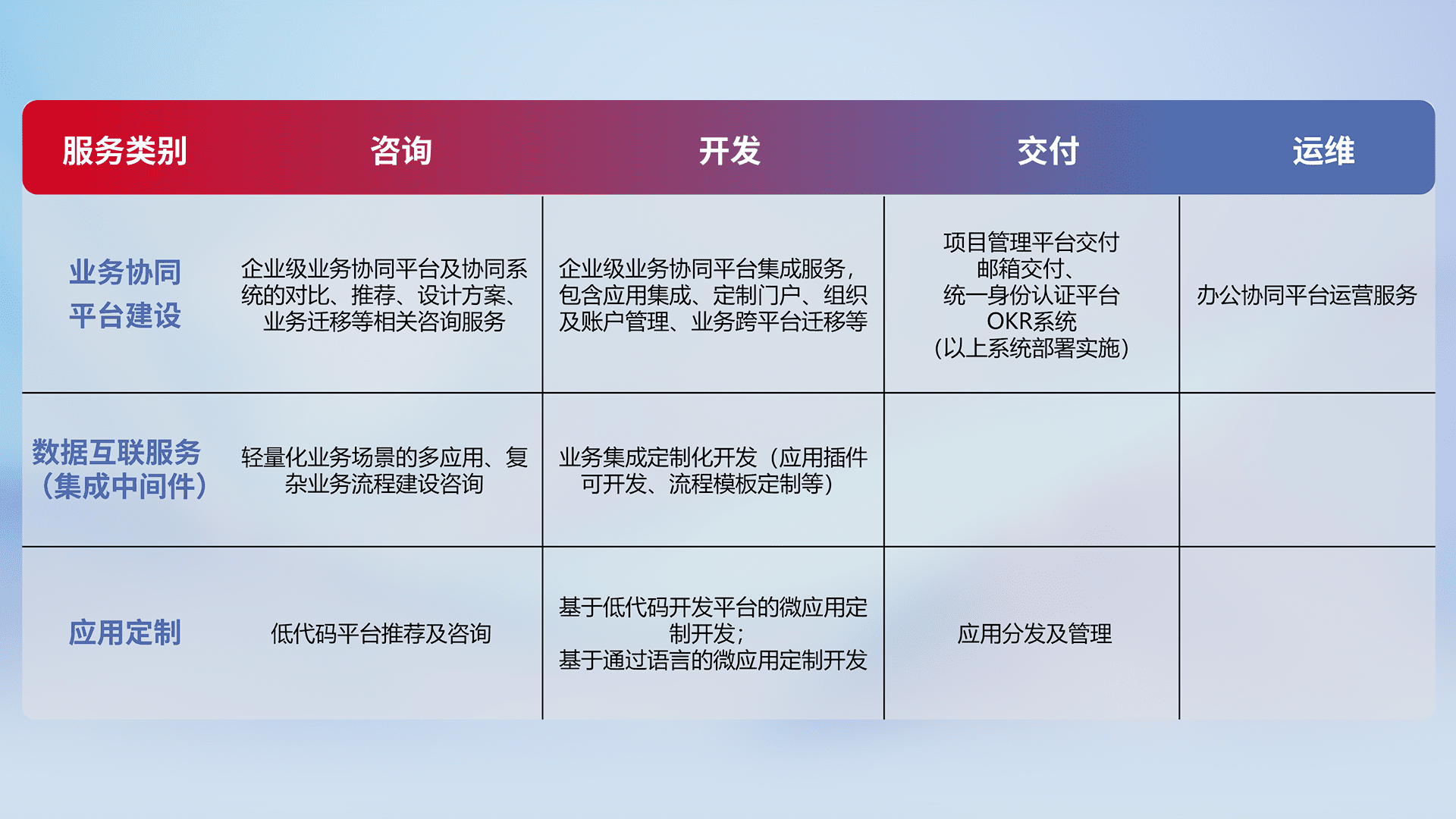针对钉钉、、、、企微、、、IDaas等平台级产品提供产品的规划、、、、方案、、、交付、、、、定制化开发等服务,,实现如统一协同办公、、智能客户服务、、、、混合会议管理、、智能数据查询、、等业务场景,,,,实现数字化转型。。。